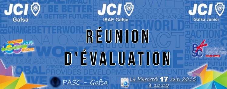 Les Jeunes Chambres Internationales de ISAE Gafsa, Gafsa et Gafsa Junior ont l’immense plaisir de vous coutoyer à la réunion d’évaluation du premier semestre ,qui aura lieu le mercredi 17 juin 2015 au local du PASC Gafsa.