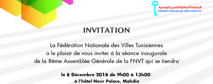 La Fédération Nationale des Villes Tunisiennes à l’honneur de vous inviter à la séance inaugurale de son Assemblée Générale le samedi 8 décembre 2018 de 09h00 à 14h00 à l’hôtel Nour Palace – Mahdia.