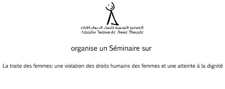 Ce séminaire organisé par l’Association Tunisienne des Femmes Démocrates le samedi 18 octobre 2014 a pour objectif de faire l’état des lieux de la traite des personnes, de cerner a l’échelle nationale et international les facteurs qui l’encouragent et en font une violation flagrante des droits humains des femmes et une atteinte a leurs dignité, afin d’examiner les meilleurs moyens de lutte pour son éradication. Il s’inscrit dans le cadre de notre lutte contre et les violences faites aux femmes et aux petites filles et de notre revendication des droits des femmes à la citoyenneté.