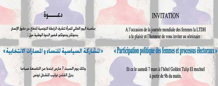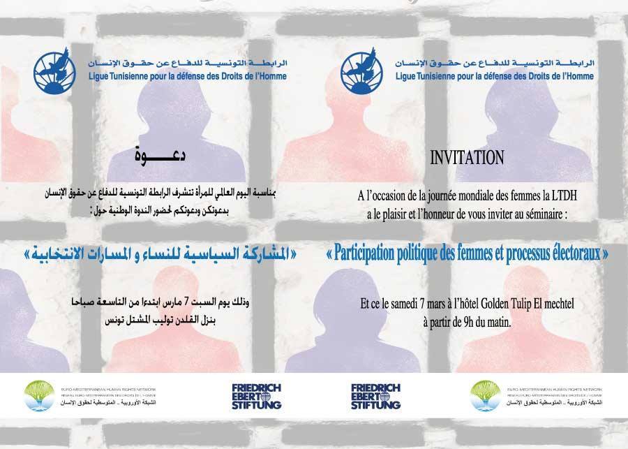 Dans le cadre de la journée mondiale des femmes, le Réseau Euro-méditerranéen des Droits de l’homme et la Ligue Tunisienne des Droits de l’Homme en collaboration avec ces différents partenaires organise une journée pour mettre l’accent sur la participation de la femme dans la gouvernance locale et son intégration dans les différents processus électoraux.