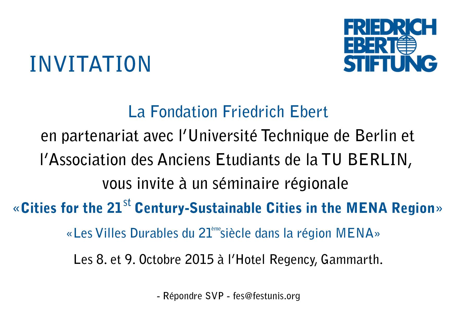 Séminaire régionale: « Les villes durables du 21 ème siècle dans la région MENA » qui se tiendra les 8 et 9 octobre 2015 à l’Hotel Regency, Gammarth