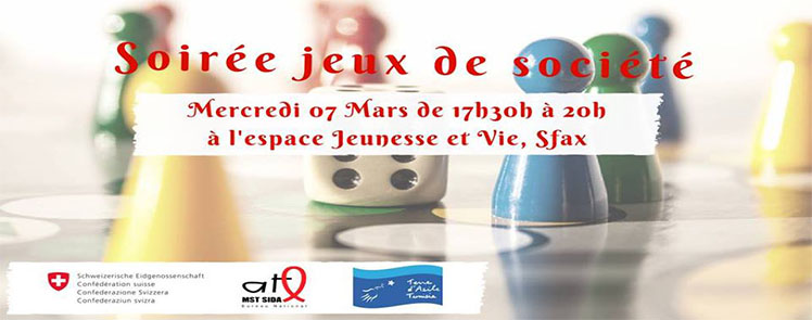 L’ATL MST SIDA Bureau national vous invite à une soirée jeux, le mercredi 07 mars 2018, à partir de 17h30 à Espace Jeunesse et Vie. Vous trouverez à votre disposition de nombreux jeux de société, un babyfoot, un billard…