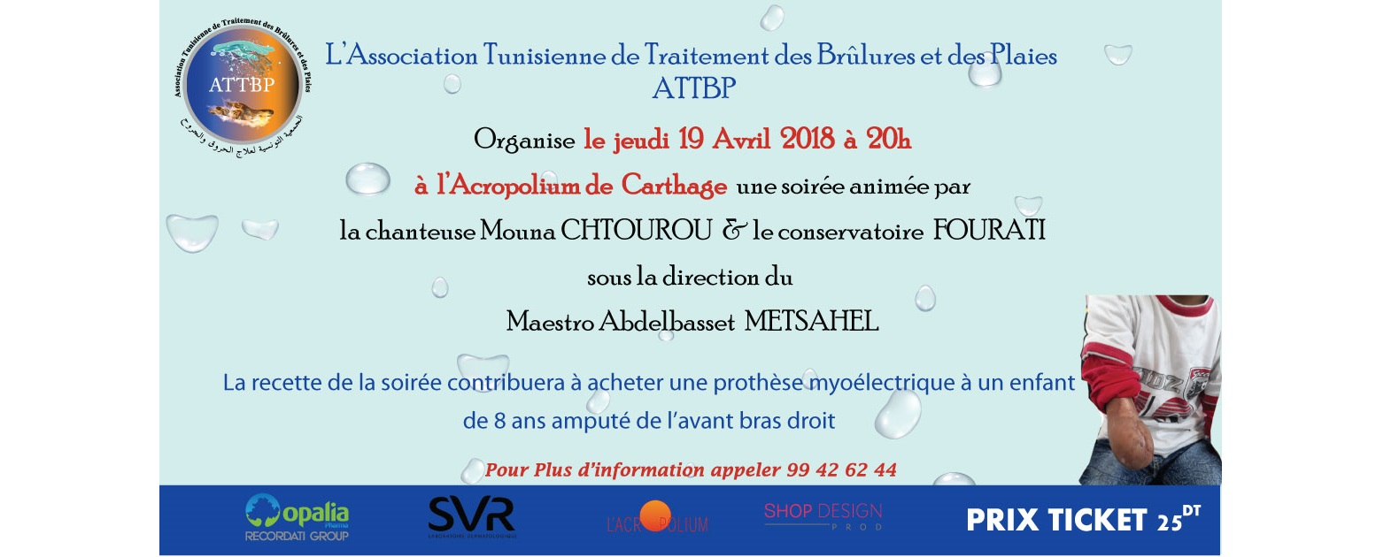 L’Association Tunisienne de Traitement des Brûlures et des Plaies ATTBP organise le jeudi 19 avril a l’acropolium de cartage un spectacle musical animé par Mouna Chtourou sous la direction du violoniste Abdelbasset metssahel à 20h30.