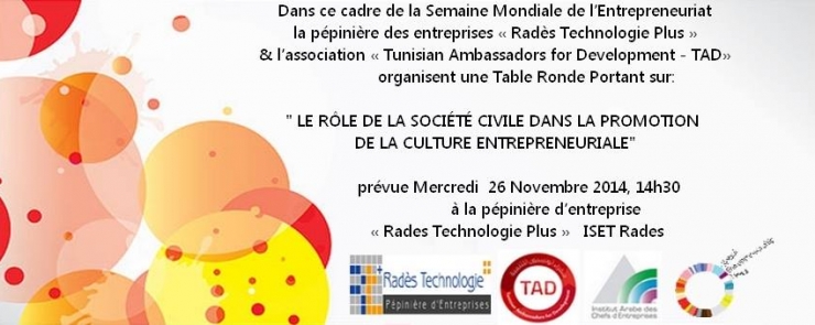 Dans ce cadre de la Semaine Mondiale de l’Entrepreneuriat, la pépinière des entreprises « Radès Technologie Plus » et l’association « Tunisian Ambassadors for Development – TAD» organisent une Table Ronde Portant sur:
