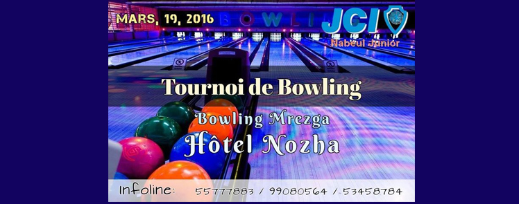 Et oui, c’est la première à Nabeul: Un magnifique tournoi de bowling organisé par la Jeune Chambre Internationale Nabeul Junior qui se tiendra le 19/03/2016 à l’hôtel Royal Nozha, Mrezgua.