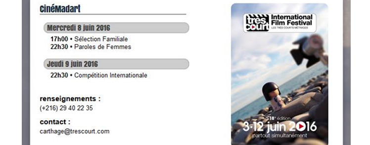 Les 8 & 9 juin, on se rafraichit avec le revigorant Très Court métrage Film Festival, en partenariat avec l’Institut Français de Tunisie. 🙂