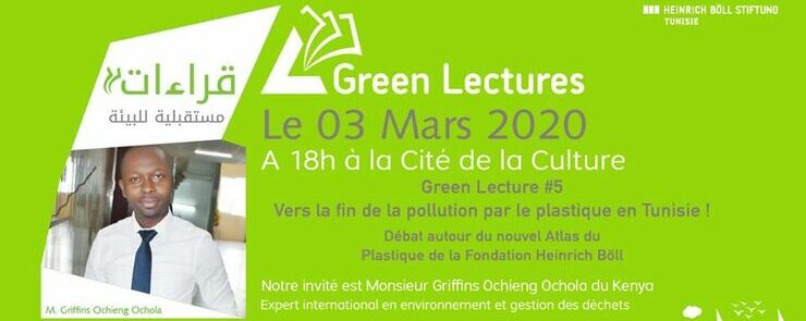 Outre la présentation de l’Atlas du Plastique, la Green Lecture #5 débattra avec l’expert environnemental du Kenya, Griffins Ochola, la perspective africaine et kenyane de lutte contre la crise du plastique. Il suivra un panel tunisien qui enchainera avec les enjeux et les conséquences qui découlent de la dépendance de la société tunisienne au plastique.
