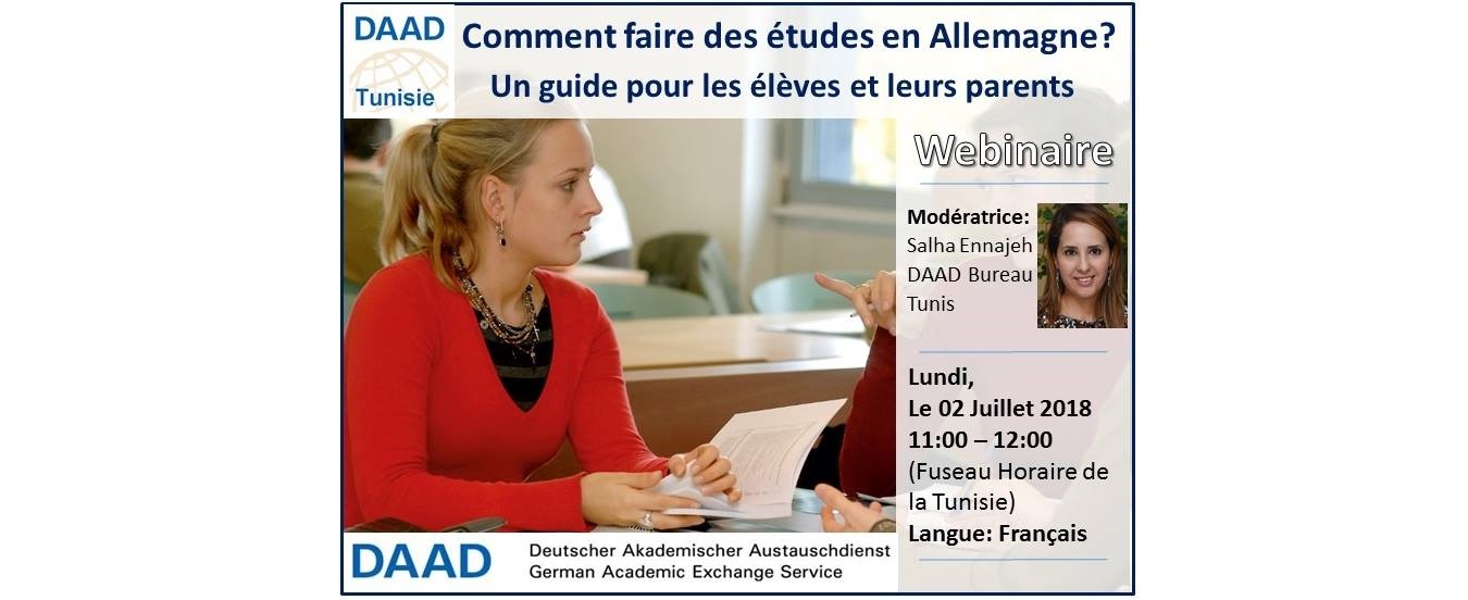 Le DAAD Tunis propose un webinaire (une présentation en ligne) autour du thème « Comment faire des études en Allemagne? Un guide pour les élèves et leurs parents ». Le webinaire aura lieu lundi, le 2 Juillet 2018 et sera modéré par Mme Salha Ennajeh du DAAD Bureau Tunis. Pour participer, vous aurez seulement besoin d’un ordinateur/ smartphone et d’une bonne connexion Internet.