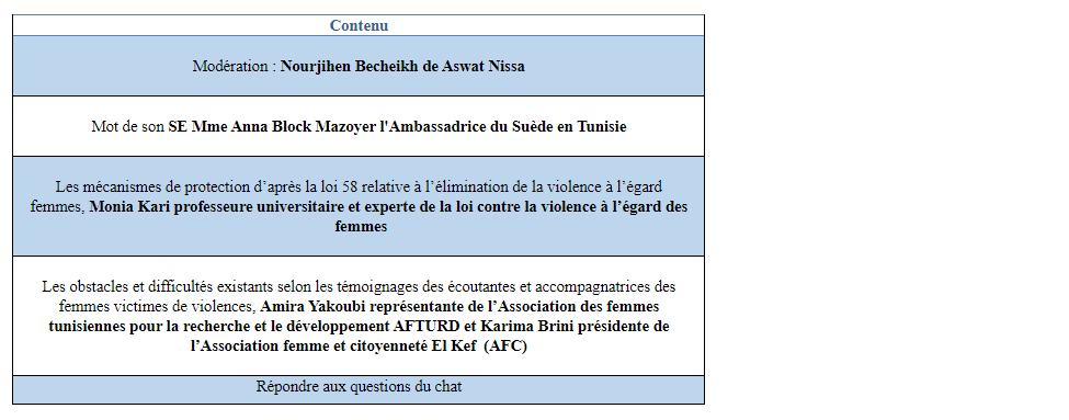 Aswat Nissa, AFTURD et AFC vous invitent à nous rejoindre mercredi 13 mai à 21h :30 pour un webinar intitulé « les obstacles que les femmes victimes de violence rencontrent depuis le début du confinement » afin de mieux comprendre les droits et services à la disposition des femmes victimes de violences conformément à la loi n ° 58 relative à l’élimination de la violence à l’égard des femmes. En outre, ce Webinar permettra d’identifier les difficultés et obstacles auxquels les victimes sont confrontées.