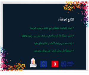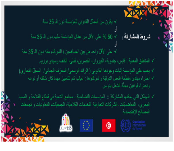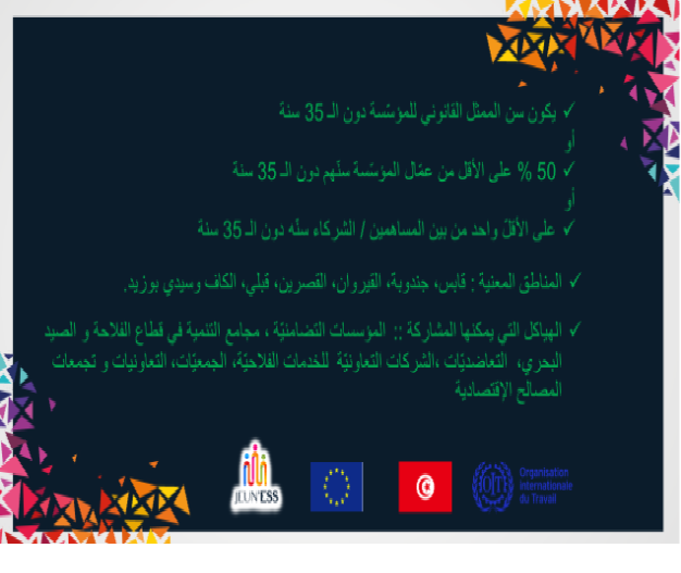 يندرج مشروع JEUN’ESS » تطوير الاقتصاد الاجتماعي و التضامني و خلق فرص عمل لائق للشباب التونسي” المنفذ فنيّا من طرف منظمة العمل الدوليّة بالشراكة مع وزارة الاقتصاد و الماليّة و دعم الاستثمار في إطار برنامج EU 4 YOUTH )برنامج دعم الشباب التونسي ( و المموّل من طرف الاتحاد الأوروبي ) بمقتضى اتفاقيّة التمويل بين الحكومة التونسيّة ممثّلة من طرف وزارة التنمية و الاستثمار و التعاون الدولي و الاتحاد الأوروبيENI2018/041-0142 (