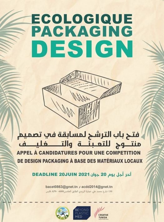 في إطار مشروع » الواحات المتوسطية بتونس: العمل من أجل بحر خال من البلاستيك » بدعم من منظمة « Beyond Plastique Med BeMed » بفرنسا و مشروع » تونس الابداعية Créative Tunisia » تفتح « جمعية مواطنة وتنمية مستدامة بقابس » ACDD Gabès » باب الترشح لمسابقة في تصميم منتوج تعبئة وتغليف إيكولوجي « Packaging Ecologique. »