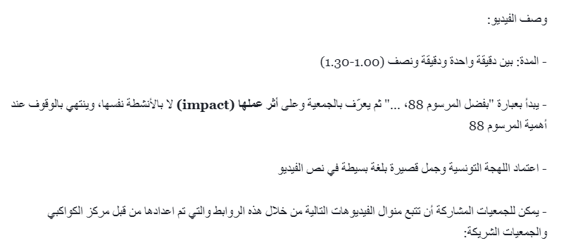 في إطار مواصلة تركيز جهود المجتمع المدني في الدفاع على فضائه من كل التهديدات التي طالته ولاتزال، يسر مركز الكواكبي للتحولات الديمقراطية أن يضع على ذمتكم هذا الفيديو حول المرسوم 88 لسنة 2011 المنظم للجمعيات الذي يعد مكسبا وطنيا وديمقراطيا ساهم في خلق تغيير إيجابي وطنيا وجهويا ومحليا، وعليه، فلا مجال للتراجع عنه.هذا الفيديو من إعداد مركز الكواكبي للتحولات الديمقراطية، بدعم من منظمة أوكسفام.Oxfam en Tunisieشكر خاص لجمعية Wallah We CanAvocats Sans Frontières en Tunisie – ASF Jamaity Al Bawsala Mourakiboun EuroMed Rights – Tunisia FIDH – International Federation for Human Rights كلام CALAM الرابطة التونسية للدفاع عن حقوق الانسان الصفحة الرسمية Ltdh