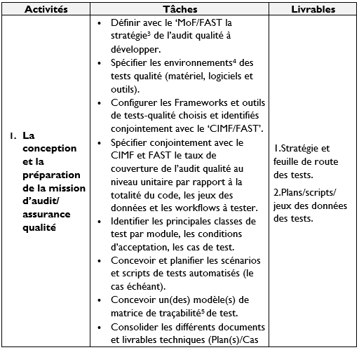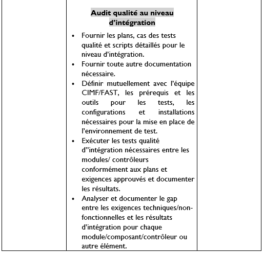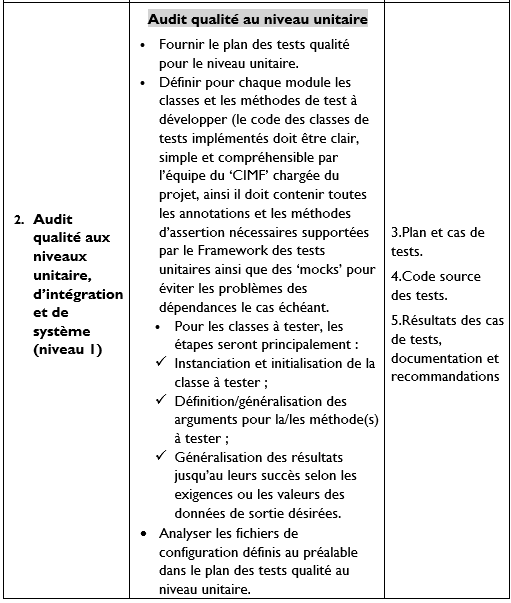 • Audit qualité aux différents niveaux : unitaire, d’intégration et de système (niveau 1).