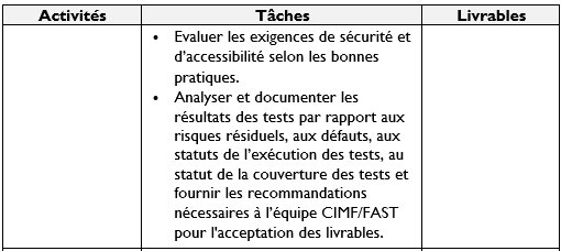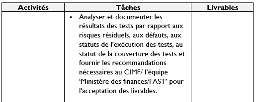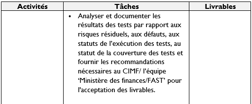 NB : En plus des activités et livrables mentionnées ci-dessus, d’autres activités/tâches/livrables liées au périmètre du projet peuvent être affectés par le responsable de l’objectif 2 ‘équipe FAST’.