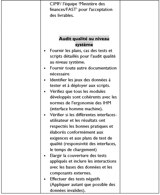 Dans ce cadre, le ministère de l’économie, des finances et de l’appui à l’investissement a sollicité du projet FAST une assistance technique pour financer une mission d’assurance qualité logicielle qui couvre principalement l’aspect structurel et technique (architectural & code)du périmètre d’intervention mentionnée ci-dessus afin de finaliser la mise en exploitation de cette première phase dans les plus brefs délais.