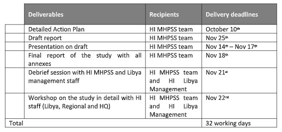 This study will be monitored by HI teams and partners in Tunis and Libya, HI MHPSS Project Manager, MHPSS Specialist in Tunis, and the Operations Manager in Tunis.