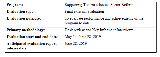 ABA ROLI in Tunisia, together with program partners will identify the team members for the evaluation and share with the consultant upon launch of the evaluation. The evaluation team will provide support and oversight for the following points: i) evaluation deliverables – review and feedback for evaluation design and report; ii) evaluation materials – provision of package of materials on program design, implementation and monitoring iii) logistics – organizing meetings with evaluation target respondents, including program representatives.