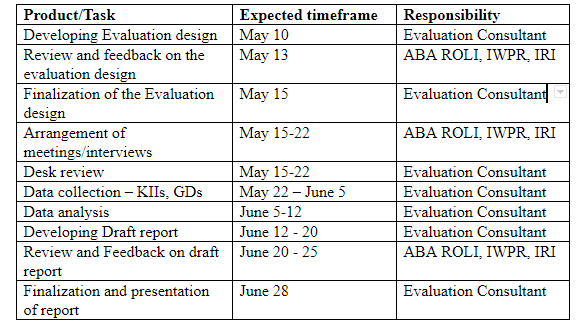 The ABA Office in country, together with implementing partner IWPR and IRI, in coordination with ABA ROLI Staff in Washington D.C., will be responsible, for arranging the logistics for this evaluation. Implementing partners will provide the consultant with all program related materials.