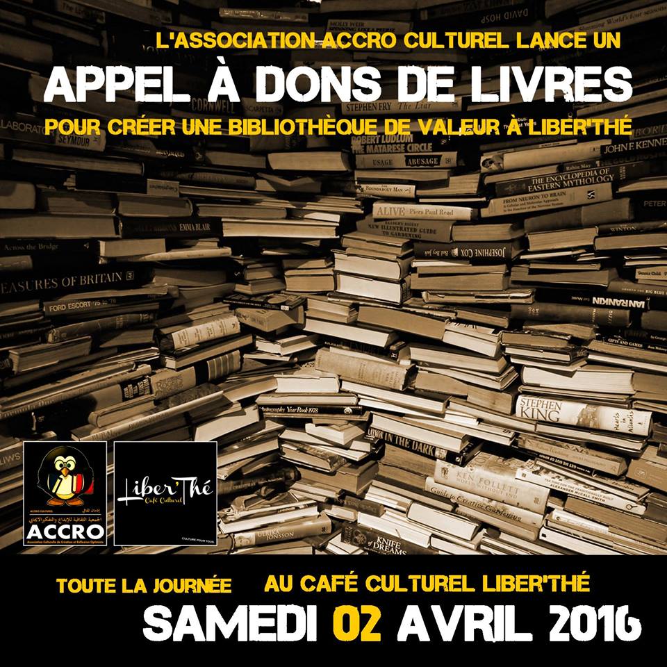 Dans le cadre du projet ACCRO-Bibliothèque, l’Association Culturelle de Création et Réflexion Optimiste ACCRO Culturel – إدمان ثقافي lance un appel à dons de livres pour la création d’une bibliothèque de valeur à Liber’Thé.