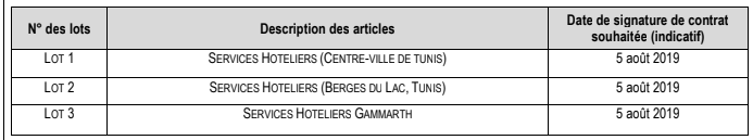 Toutes les offres doivent être soumises avant le 29/07/2019 à 10h00, heure locale aux adresses mentionnées ci-dessus dans une enveloppe scellée avec la mention : «T/1499/FWC/Services Hôteliers/TUN/16072019 ne pas ouvrir avant 31/07/2019 » et l’objet de l’offre ainsi que le/les numéro(s) du ou des lots pour le(s)quel(s) ils soumissionnent. Les offres en retard seront automatiquement rejetées.