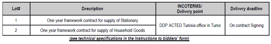 ACTED provides relief assistance to victims of conflict and vulnerable populations. Its activities range from emergency relief to development projects in the following States of Tunisia respectively. ACTED is inviting Media Companies to submit their bid for the provision of Stationary and Household Goods :