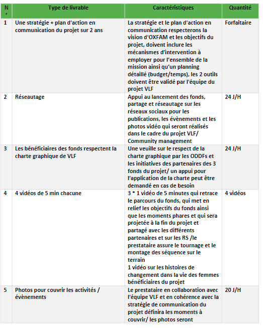 En proche collaboration avec l’équipe du projet, l’agence de communication sera chargée de concevoir une stratégie de communication complète du projet, dans le respect du guide de visibilité d’Oxfam et d’AMC. L’agence de communication devra être une Agence-Conseil en communication avec une expérience dans les campagnes de mobilisation sociale. L’agence sera chargée de prendre en compte les besoins stratégiques et opérationnels du projet dans le sens large en intégrant les dimensions d’information, de visibilité et de promotion. Les responsabilités incluront l’identification des meilleurs canaux et outils de communication avec les publics cibles dont les jeunes, les femmes, que ce soit au niveau des communautés locales ou à l’échelle nationale, et ceafin d’assurer un flux de partage d’information adaptés aux audiences visées.
