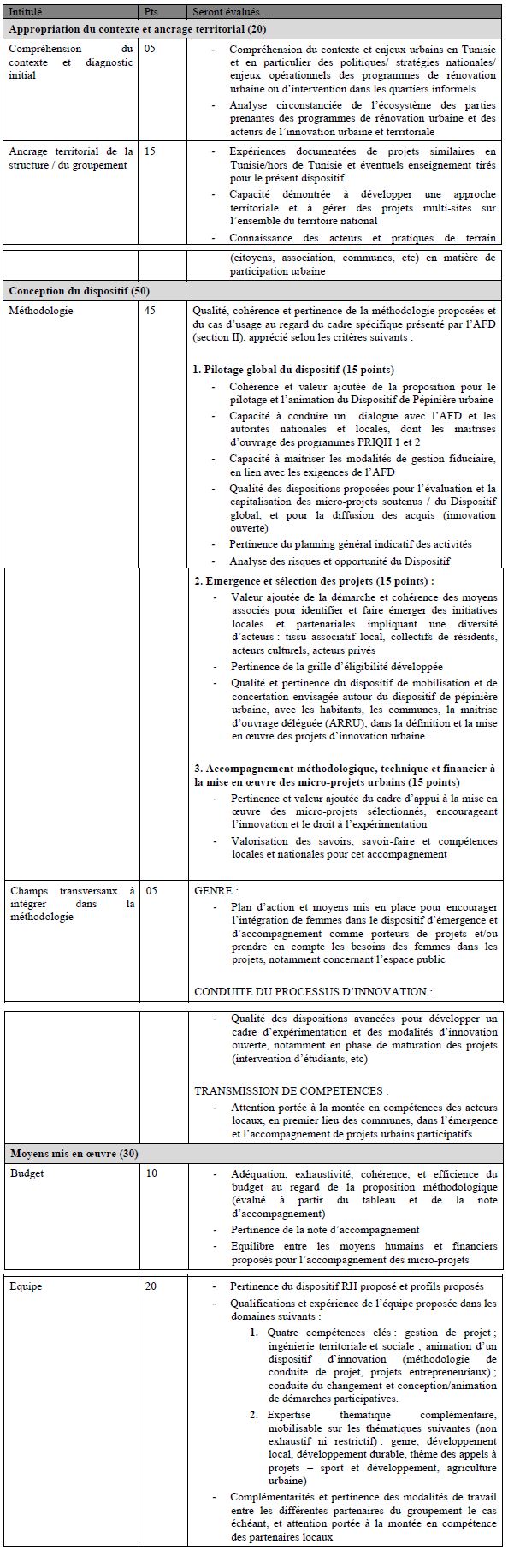 1.3 Cet Appel à initiatives (« l’Appel ») a pour vocation d’identifier le Pépiniériste qui concevra et pilotera le Dispositif en Tunisie. Les critères d’analyse des propositions sont détaillés ci-dessous.
