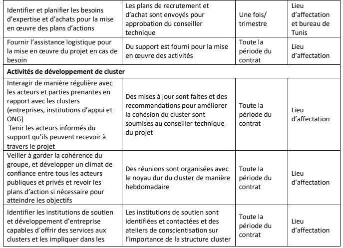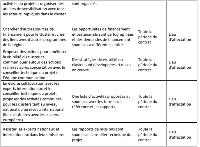 Le projet est financé par la Commission européenne avec une contribution de l’Agence italienne de coopération au développement pour un montant total de 9.000.000 EUR et une durée totale de 5 ans. En coordination avec l’équipe de l’ONUDI à Vienne et sous la supervision du chef de projet à Vienne et du conseiller technique à Tunis, l’expert en développement de cluster sera en charge des taches suivantes :