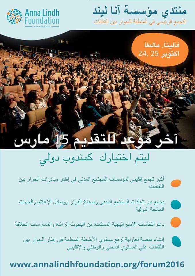 (Offre en anglais)The Anna Lindh Foundation lance un appel à candidatures pour the Anna Lindh Euro-Mediterranean Forum 2016 Retour vers les opportunités