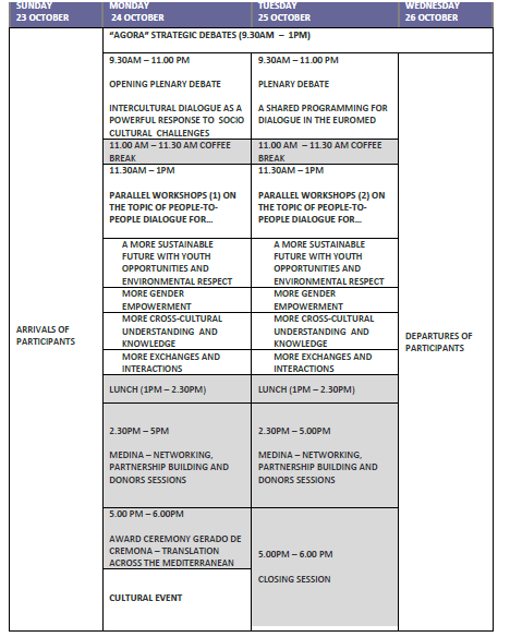 The Forum is to be structured around three main formats for exchanges and debates Agora, Intercultural Fair/Medina, Closing session: