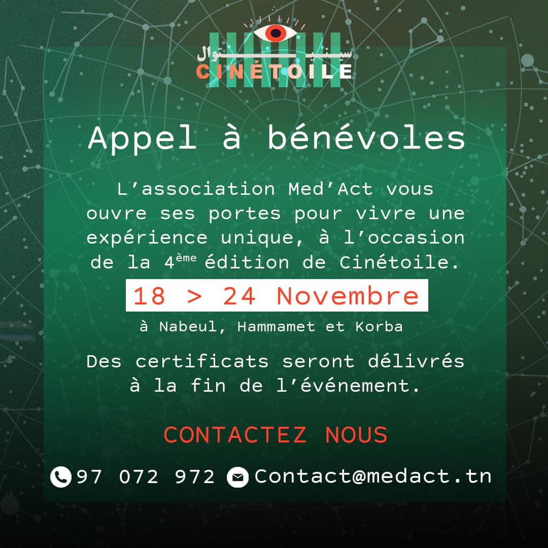 Vous souhaitez vivre une expérience unique et plaisante !  Vous êtes passionnés par l’action et la vie associative !  Vous désirez donner de votre temps, dans un cadre hivernal / estival convivial !  L’Association Med’ACT vous ouvre ses portes, à l’occasion de la 4ème édition de Cinétoile (Cinéma sous les étoiles), qui se déroulera du 18 au 24 Novembre 2021 📍( Nabeul, Hammamet et Korba)