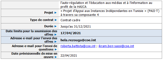 Ce contrat s’inscrit dans le cadre du « Projet d’Appui aux Instances Indépendantes en Tunisie (PAII-T) », cofinancé par l’Union européenne et le Conseil de l’Europe et mis en œuvre par ce dernier. Ce Programme vise à accompagner la mise en place des instances indépendantes en Tunisie prévues par la constitution de 2014 ainsi que d’autres instances indépendantes non-constitutionnelles et à leur apporter l’appui technique, financier et logistique nécessaire dans l’exercice de leurs mandats et de leurs attributions statutaires en toute indépendance. Une composante du projet se concentre sur l’appui à la Haute Autorité Indépendante de la Communication Audiovisuelle (HAICA) en particulier au travers de la fourniture d’un centre de ressources et de formation en ligne sur la régulation, l’auto-régulation et l’éducation aux médias et à l’information au profit de la HAICA