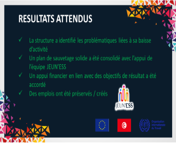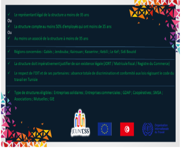 Le projet JEUN’ESS mis en œuvre par l’Organisation Internationale (OIT) en partenariat avec le Ministère de l’Economie, des Finances et de l’Appui à l’Investissement s’inscrit dans le cadre du programme EU4YOUTH (Programme d’Appui à la Jeunesse Tunisienne) financé par l’Union Européenne (Convention de financement entre le gouvernement Tunisien représenté par le Ministère de Développement, de l’Investissement et de la Coopération Internationale et l’Union Européenne ENI/2018/041-142).