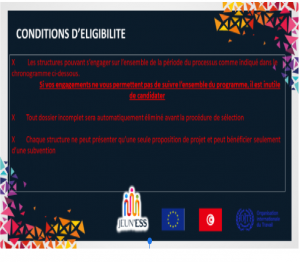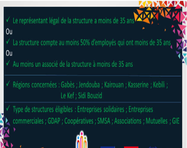 Il s’adresse principalement aux catégories de jeunes en situation de vulnérabilité présents dans les 7 régions visées par le projet, à savoir, Gabès, Jendouba, Kairouan, Kasserine, Kebili, Le Kef et Sidi Bouzid. Les critères d’éligibilité sont mentionnés dans la suite de ce document.