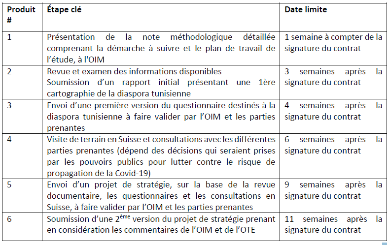 - Effectuer une visite sur terrain en Suisse (dépend des décisions qui seraient prises par les pouvoirs publics pour lutter contre le risque de propagation de la Covid-19) pour consulter les missions diplomatiques et consulaires tunisiennes, les associations, réseaux, groupes d’affaires, représentants des communautés, organisations professionnelles et étudiantes et autres parties prenantes concernées afin de : identifier les principales communautés de la diaspora et les causes de leur migration ; analyser leur contribution potentielle au développement de la Tunisie (associations, réseaux, groupes communautaires, initiatives d’affaires, chambres de commerce, etc. ) ; recueillir des informations sur les investissements réalisés par la diaspora ; identifier les possibilités, les contraintes et les stratégies pour engager la diaspora dans le développement de la Tunisie ; et enfin identifier toute initiative existante menée par la diaspora et/ou par les missions diplomatiques et consulaires tunisiennes et analyser les rôles/contributions potentiel-le-s dans l’implémentation de l’initiative SMP ;