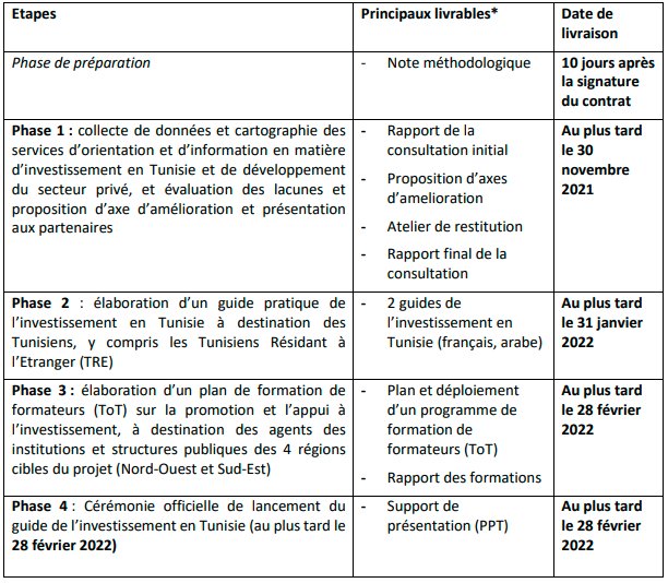 Avec l’établissement de la cartographe des services, le cabinet ou le(a) consultant(e) mènera un recueil d’informations disponibles et pertinentes, afin de concevoir un guide pratique de l’investissement en Tunisie à destination des investisseurs et promoteurs de projets Tunisiens, y compris des Tunisiens Résidant à l’Etranger (TRE). Ce produit d’information sera mis à disposition en version électronique sur les sites de l’OTE, de l’ANETI, d’autres structures publiques en relation avec l’investissement des TRE, ainsi que sur le site de l’OIM. Le cabinet ou le(a) consultant(e) prendra en charge la conception graphique du produit d’information pour publication en français et en arabe.