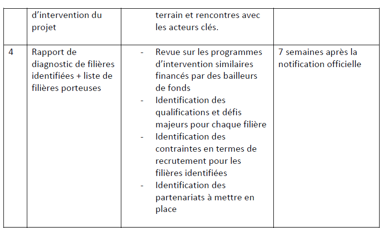 • Proposer des recommandations pour des actions et des programmes de formation dans le but de promouvoir l’emploi des jeunes dans les filières retenues. Identifier les partenariats à mettre en place, avec d’autres partenaires techniques et financiers