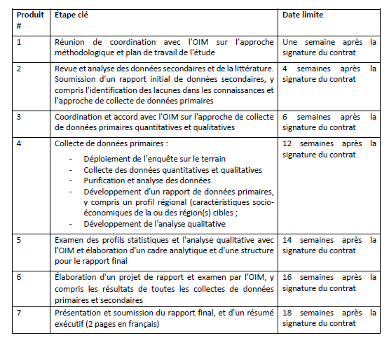 L’équipe de recherche sera responsable de l’identification et de l’analyse de toutes les données secondaires pertinentes, études, rapports, littérature, etc. Toutes les données existantes sur les facteurs qui peuvent influencer la décision d’un individu d’émigrer irrégulièrement doivent être analysées, y compris les données sur l’emploi, les niveaux d’éducation, l’intégration sociale et les conditions économiques et sociales. Les données doivent être analysées dans la zone géographique de manière approfondie, en identifiant différents contextes dans la zone du projet. Les données de l’Institut national de la statistique, des organisations internationales (ONU, Banque mondiale, etc.), des ONGs, des universités, etc. doivent être analysées. Tous les rapports pertinents doivent également être examinés et analysés. Un rapport préliminaire, décrivant les résultats, ainsi que les lacunes dans les connaissances, sera élaboré et partagé avec l’OIM pour éclairer la conception de la collecte de données primaires.