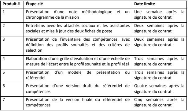 1) Discuter avec l’OIM et l’OTE de la démarche à suivre pour la réalisation de la consultation et élaborer une note méthodologique, à valider par l’OIM et l’OTE. L’OIM veillera à l’organisation d’un entretien avec les responsables d’encadrement des attachés sociaux et des assistantes sociales afin d’avoir plus de clarifications quant aux attentes de l’OTE avant la conception de la note méthodologique, présentant la démarche pour l’élaboration du référentiel ;