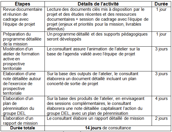 La durée totale de la mission est estimée à 14 jours de prestation qui seront répartis selon le calendrier suivant