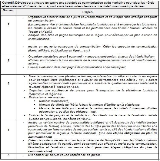 - Ob 2Développer et mettre en œuvre une stratégie de communication et de marketing pour aider les hôtels et les maisons d’hôtes à mieux répondre aux besoins et aux commentaires des clients via une plateforme numérique