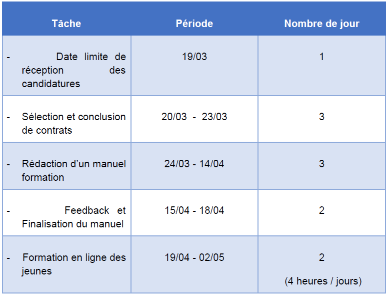 Il sera mis en contact avec 20 à 25 jeunes formateurs, appartenant à des associations partenaires dans différentes régions de la Tunisie, pour les initier à former d’autres jeunes en utilisant le support de formation initial. Ceci sera proposé sous forme de formation aux jeunes formateurs afin de les guider dans la préparation des différentes formations et créer une sorte de synergie et d’ échanges entre eux. Nous ciblons 10 jeunes qui ont suivi une formation des formateurs au sujet des Changements climatiques dans le cadre d’un autre projet, tout en ciblant des jeunes formateurs maîtrisant la thématique.