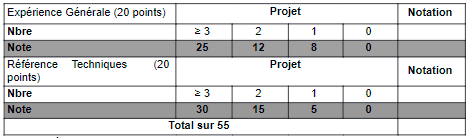- Références techniques 30 points : Ce sous critère jugera en particulier, l’expérience du soumissionnaire sur la base du nombre de projets similaire.