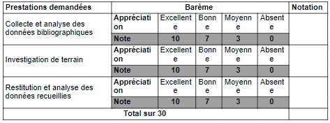 répartition des tâches et leur cohérence avec la méthodologie proposée. L’évaluation sera effectuée conformément au barème suivant :