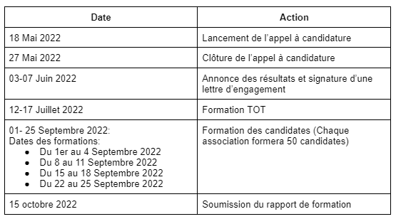 5 OSC seront sélectionnées pour bénéficier de la formation , chaque association désigne 2 personnes pour devenir formateurs/formatrices.
