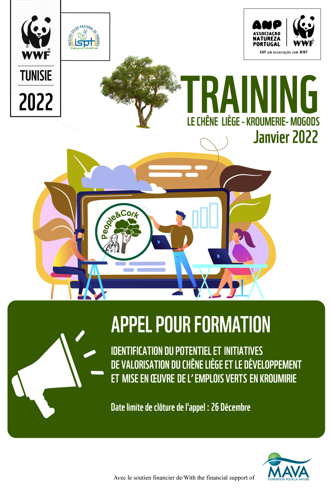 People & Cork est un projet financé par la Fondation MAVA et mis en œuvre par le WWF Bureau de l’Afrique du Nord à Tunis en partenariat avec l’Institut Sylvo-pastoral de Tabarka, la Municipalité de Tabarka et la Société Nouvelle de Liège (SNL) et en collaboration avec la Direction Générale des forêts. Le projet People & Cork est exécuté dans la région Kroumirie – Mogods (Délégations de Ghardiamou, Fernana, Ain Draham et Tabarka à Jendouba, Délégation de Nefza à Beja et Délégation de Sajnen à Bizerte).