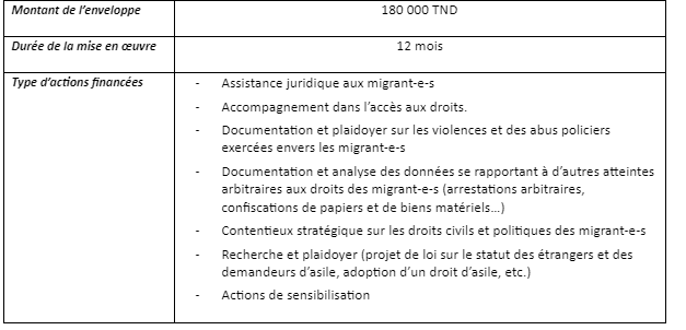 Cet appel a pour objectif général d’appuyer les organisations de la société civile (OSC) dans leur rôle d’observation et de protection des droits des migrant-e-s à travers une approche innovante, afin d’engager un plaidoyer informé auprès des législateurs et des décideurs tunisiens sur les thématiques suivantes et de contribuer à