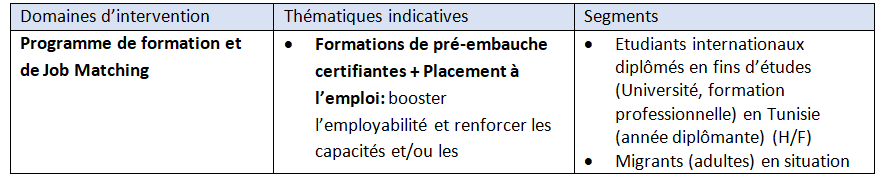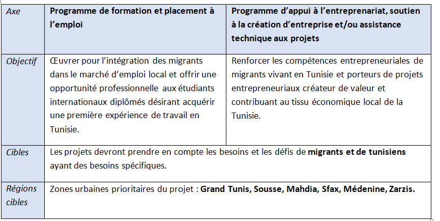 Cet appel à propositions lancé par l’OIM Tunisie sollicite les organismes intéressés de contribuer à l’insertion économique et l’autonomisation des communautés hôtes et celles de migrants en Tunisie. L’objectif du projet est d’améliorer les moyens de subsistances des communautés de migrants installés en Tunisie (étudiant.es diplômé.es, travailleur.ses, entrepreneur.ses), de renforcer l’employabilité des migrants en Tunisie et de promouvoir les opportunités des porteurs de projets installés en Tunisie.