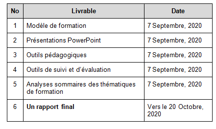 Le calendrier potentiel du déroulement des formations, comprendra plusieurs activités telles que :