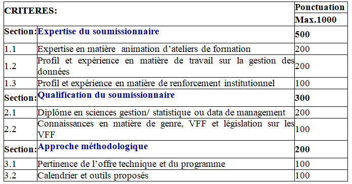 L’offre de le/ la consultant-e sera examinée en suivant les critères ci-dessous: